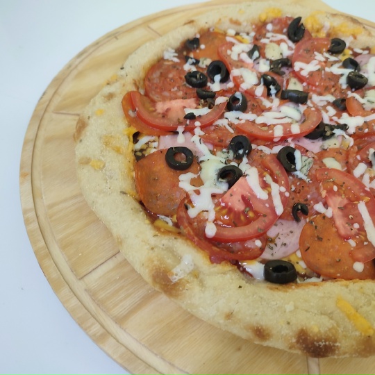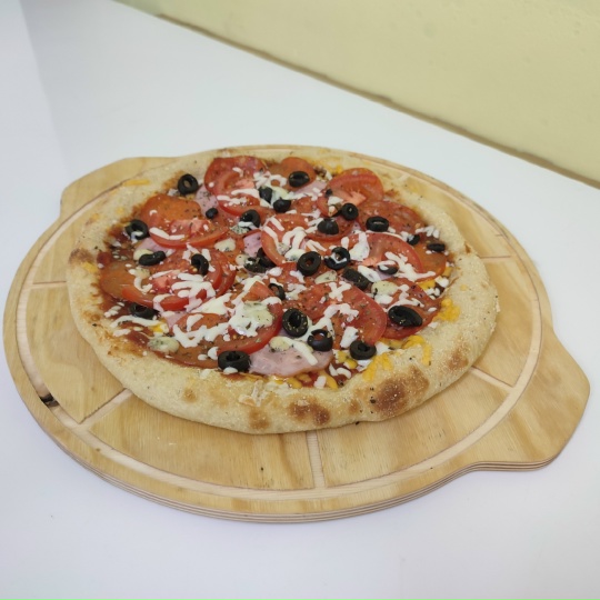 Ветчина, Пепперони, Чорризо, сыр Моцарелла, сыр Чеддер, сыр Горгонзола, свежие томаты, маслины, фиолетовый лук, базилик, соус BBQ