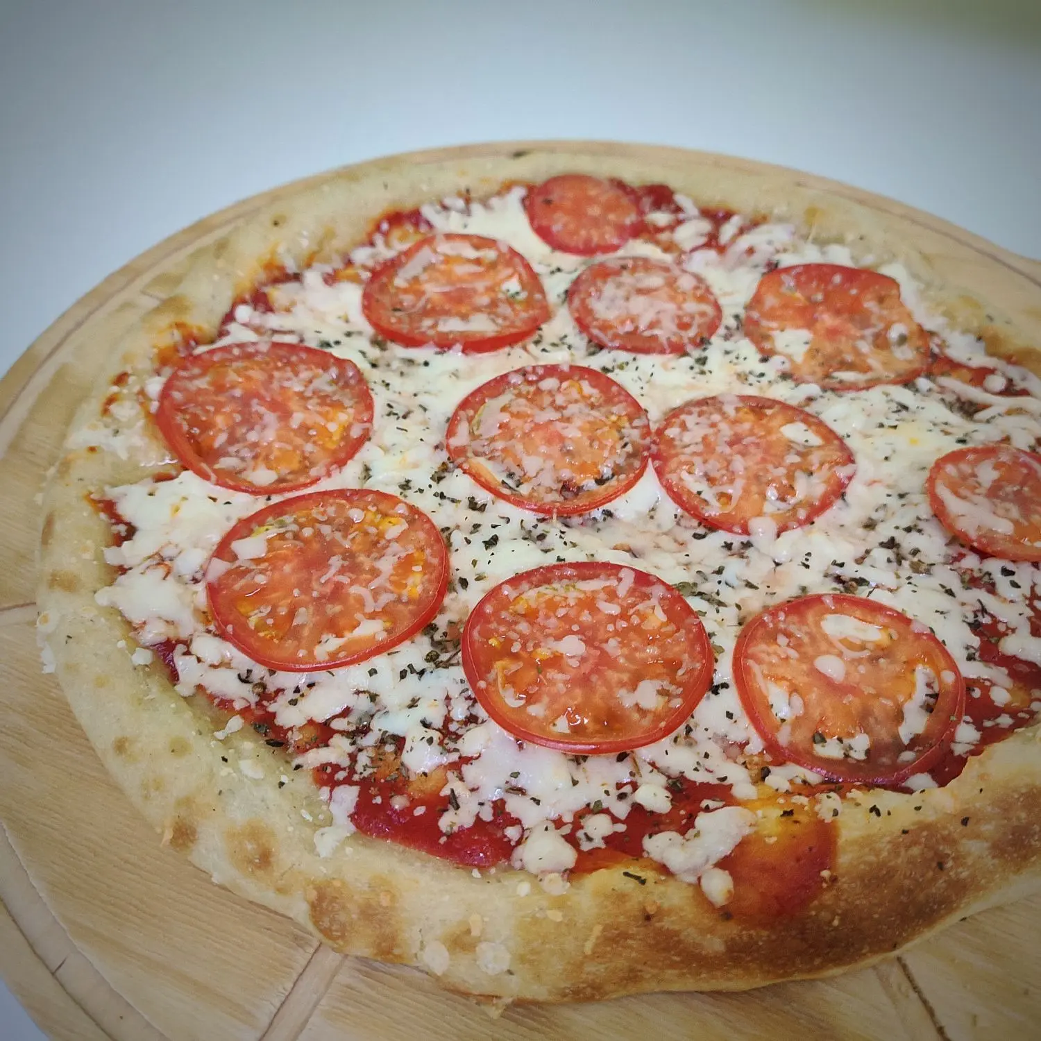 Сыр Моцарелла, свежие томаты, римская основа для пиццы, томатный соус, базилик, оливковое масло