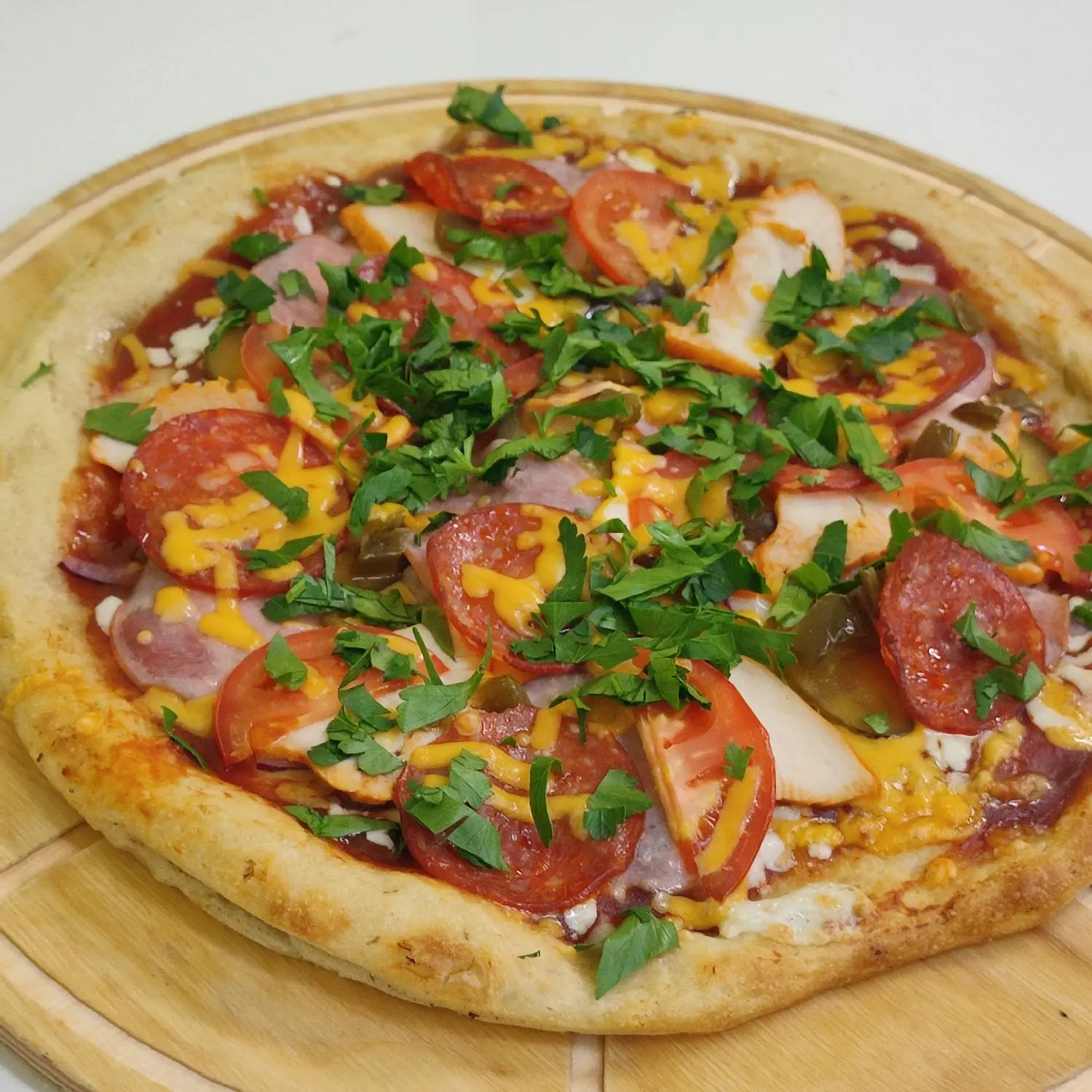 Ветчина, колбаса Чоризо, куриная грудка, сыр Моцарелла, сыр Чеддер, свежие томаты, соленый огурец, лук фиолетовый, римская основа для пиццы, соус BBQ, оливковое масло